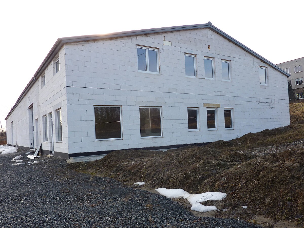 • střešní prosvětlovací pásy. Vyzděné stěny.