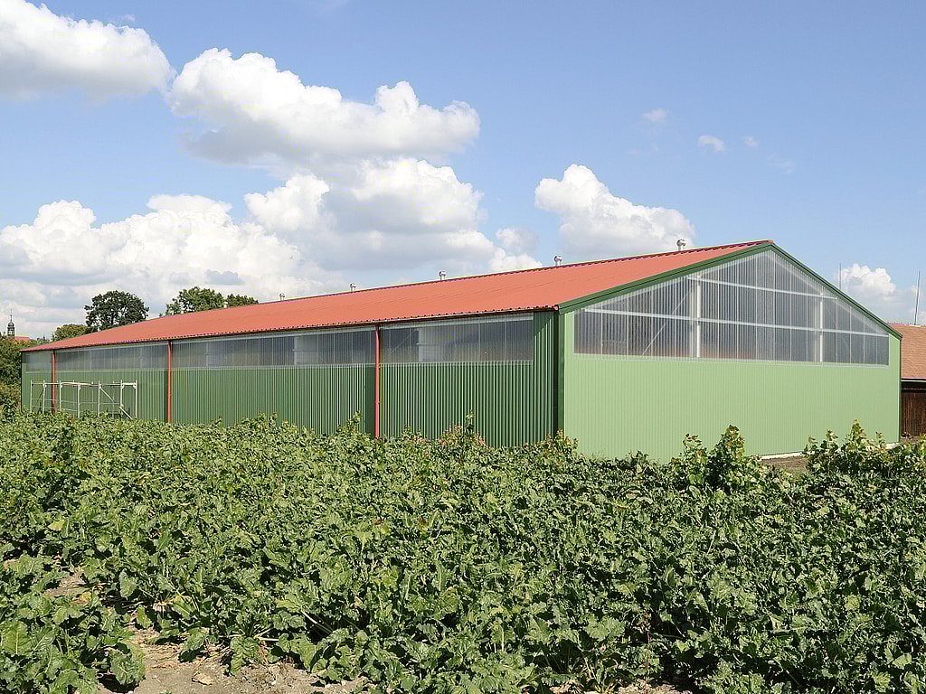 Neizolovaná jezdecká hala 14 x 57 x 5 (š x d x v) se sedlovou střechou o sklonu 15°, stěnovými prosvětlovacími pásy a posuvnými vraty.